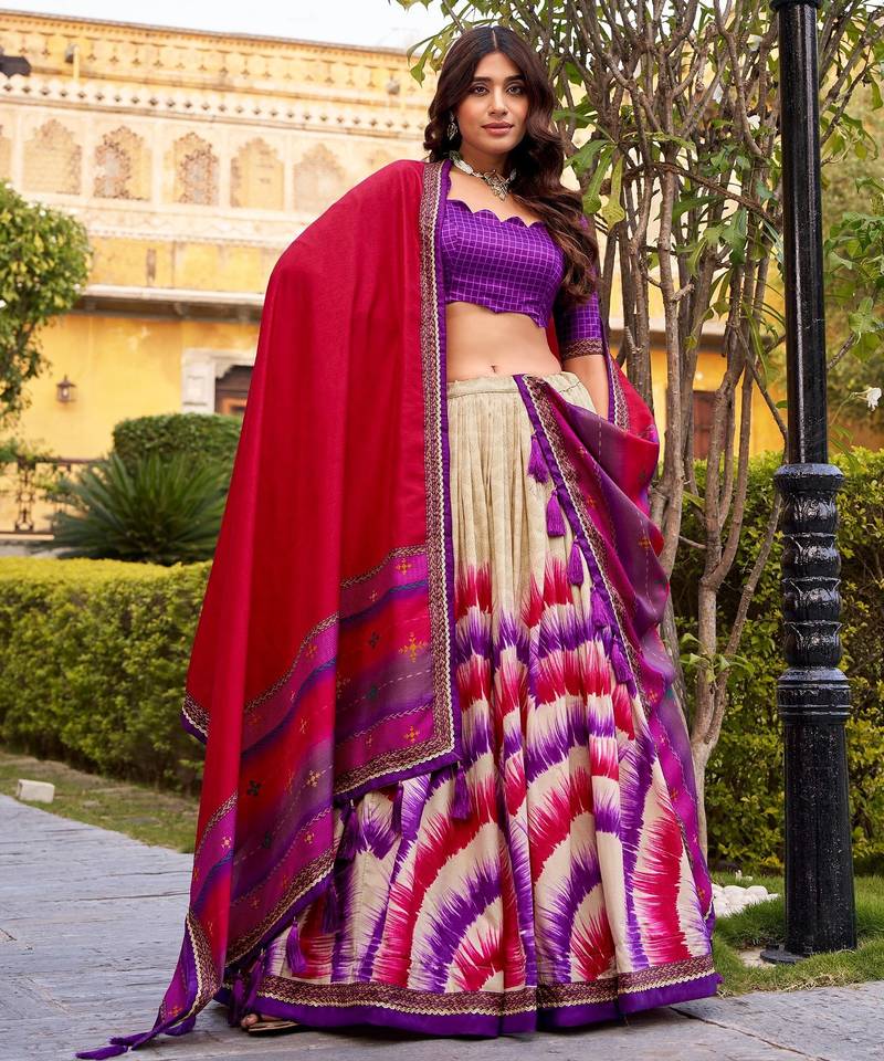 Purple Lehenga Choli Set Crafted From Tussar Silk Fabric That Gives The Outfit A Rich Texture And Graceful Appearance. The Lehenga Features Attractive Tie Dye Printed Patterns That Create A Beautiful Blend Of Colors And Enhance The Traditional Design. The Purple Blouse Adds A Refined Touch And Balances The Overall Look Of The Outfit.