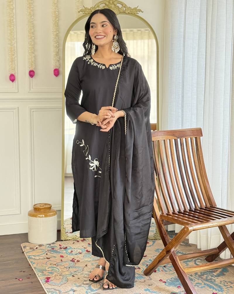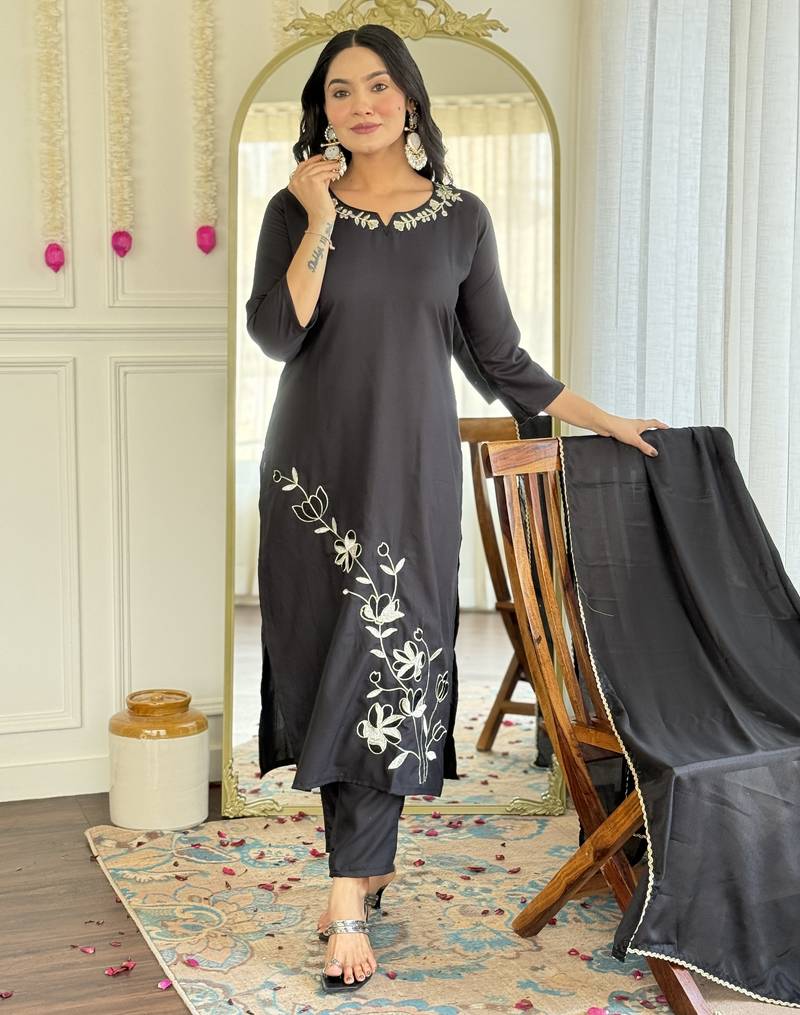 Women's black viscose rayon embroidered kurta pant set with chinon dupatta