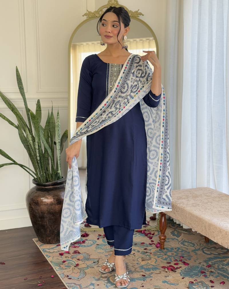 Product Name Women's Navy Blue Viscose Rayon Embroidered Kurta Pant Set With Printed Muslin Dupatta