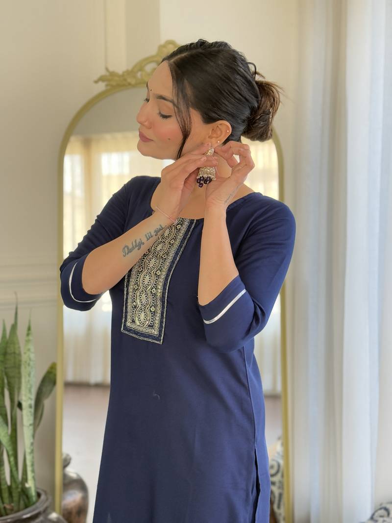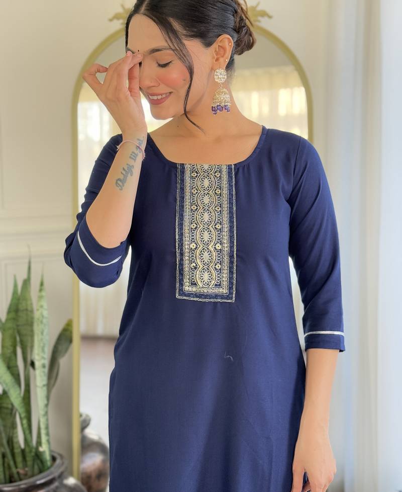 Upgrade Your Ethnic Wardrobe With This Elegant Navy Blue Kurta Set For Women, Crafted From Soft And Breathable Viscose Rayon Fabric That Offers Both Comfort And Style. The Round Neck Kurta Features Delicate Sequin And Stone Embroidery, Adding A Subtle Festive Shimmer And Refined Traditional Look. Designed For Modern Women Who Appreciate Timeless Fashion, This Beautiful Kurta Pant Set For Women Pairs Perfectly With A Coordinated Tailored Pant That Enhances The Overall Silhouette.