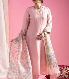 Women's pink viscose chanderi sequin stone embroidery v-neck kurta pant set with printed organza dupatta
