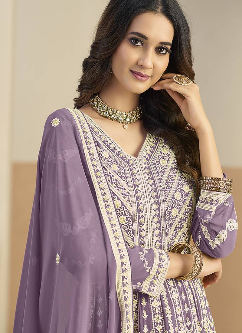 Be The Dazzling Diva Clad In Such A Light Purple Faux Georgette Anarkali Salwar Kameez. The Embroidered Work Appears Chic And Perfect For Engagement, Festival And Reception. Comes With Matching Bottom And Dupatta. (Slight Variation In Color, Fabric & Work Is Possible. Model Images Are Only Representative.)