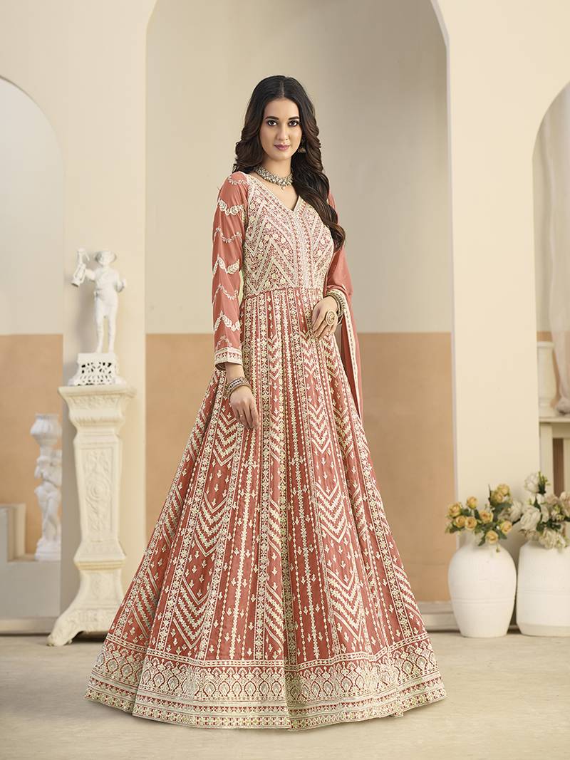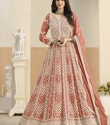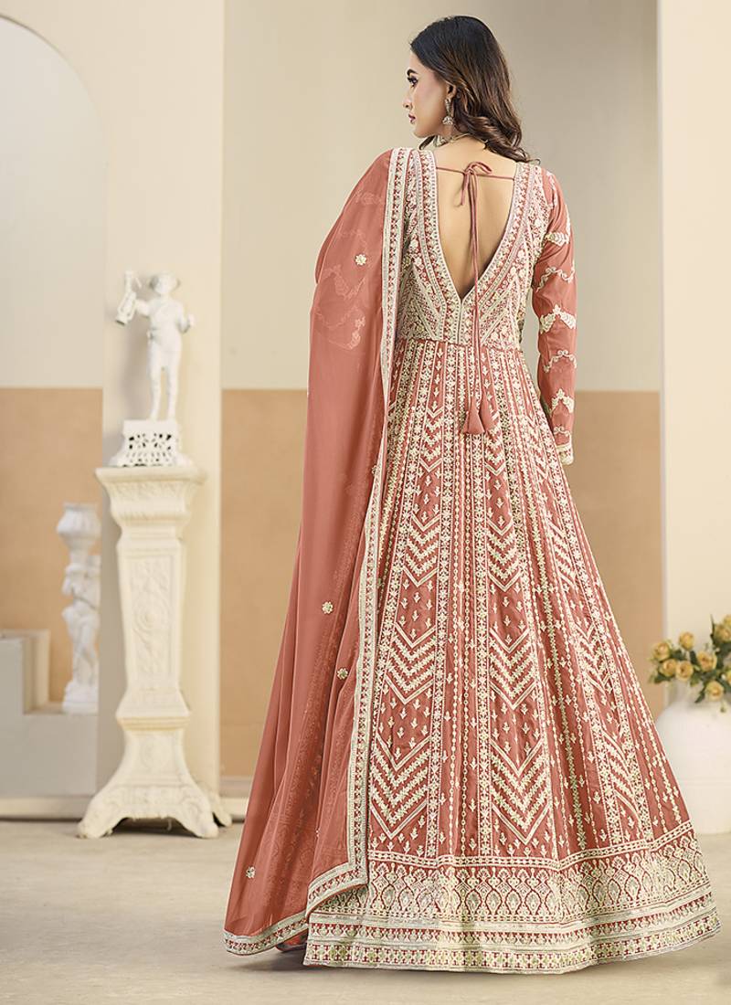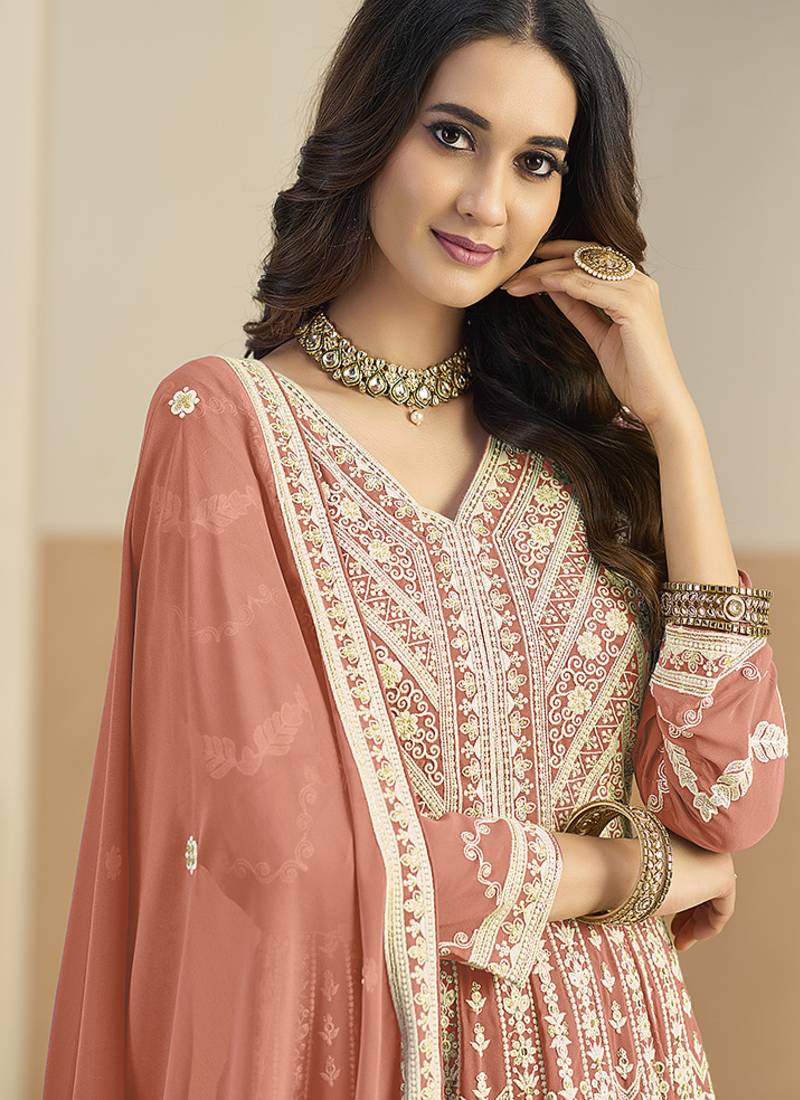 Faux georgette embroidered peach anarkali salwar kameez semi stitched