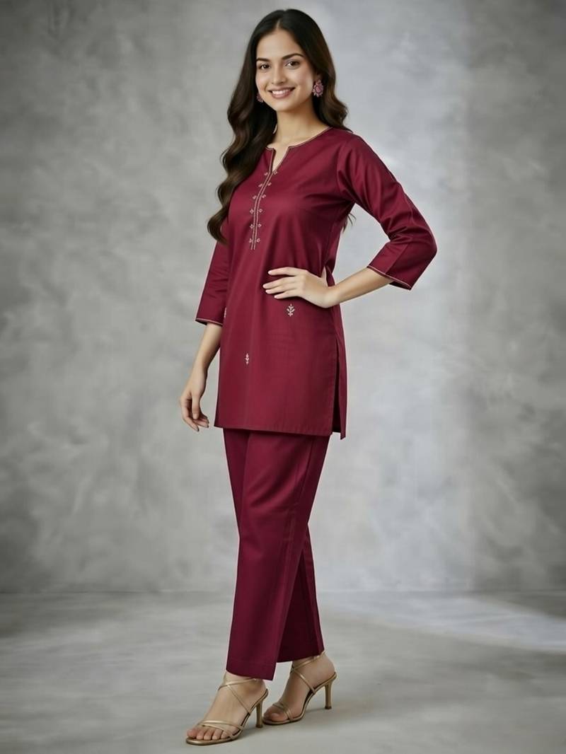 Maroon embroidered rayon kurta set stitched