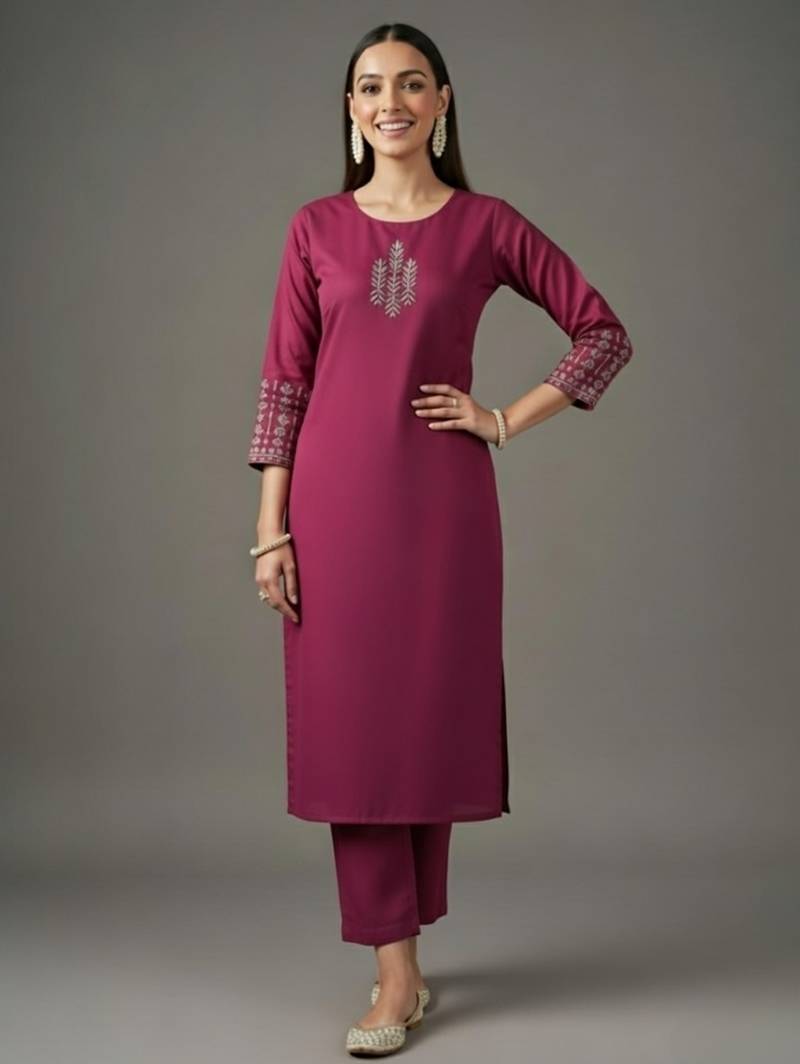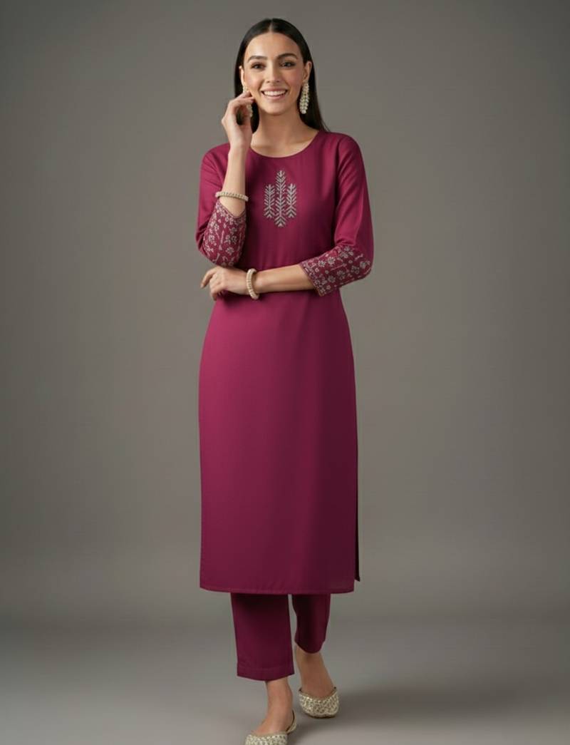 Pink embroidered rayon kurta set stitched