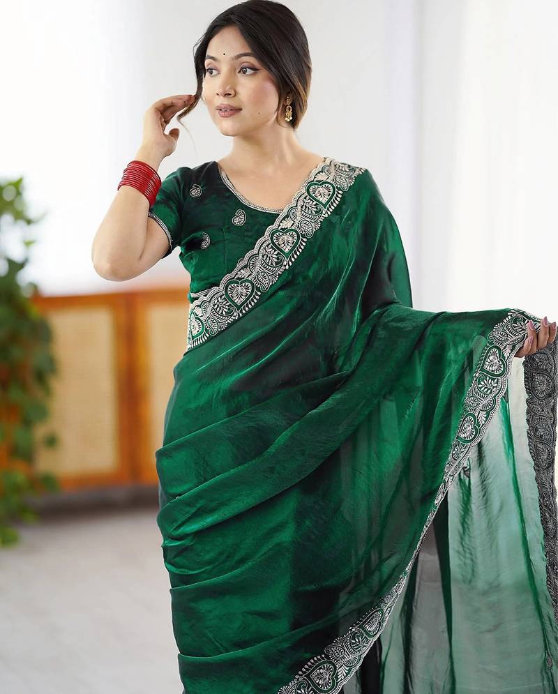 | Product Description | Step Into Elegance With This Beautiful Women’s Saree Crafted From Premium Shimmer Net Fabric, Offering A Soft, Translucent Drape With A Subtle Glittery Sheen. The Saree Is Adorned With Delicate Embroidered Buti Work And A Richly Detailed Contrast Border That Enhances Its Festive Charm. Paired With A Luxurious Banglori Silk Blouse Piece, Known For Its Smooth Texture And Royal Finish. Perfect For Weddings, Festive Celebrations, And Special Occasions. A Graceful Ensemble Designed To Give You A Refined And Captivating Look. |