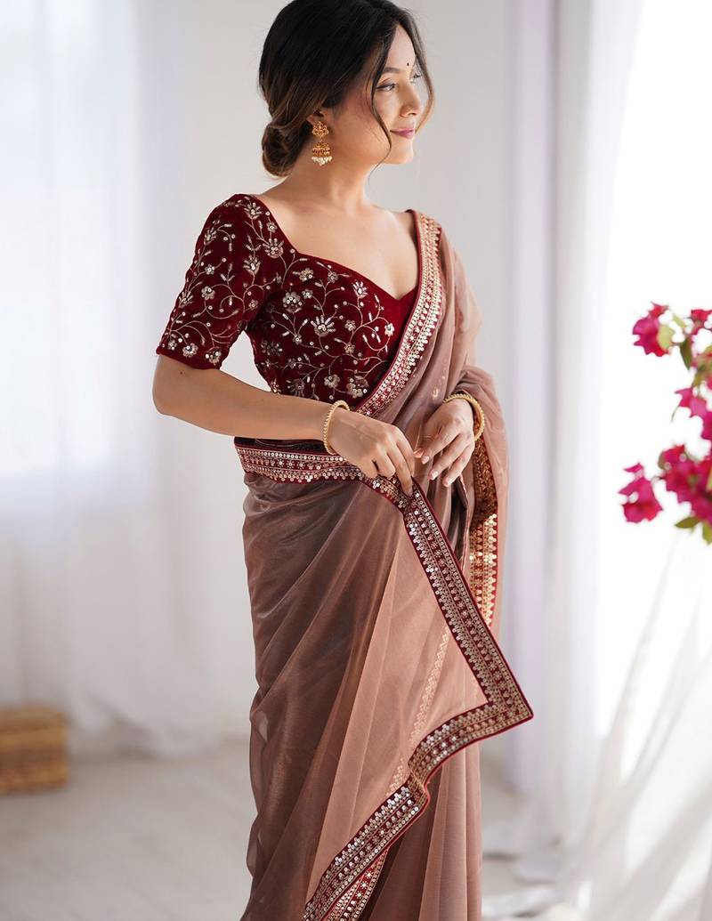 | • | Saree | : | Color- Brown / Fabric- Net |