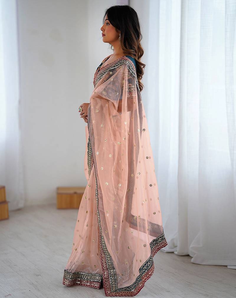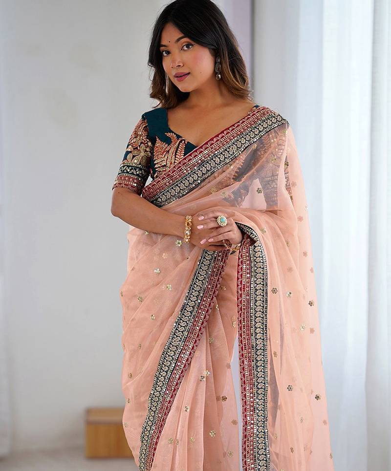 | • | Saree | : | Color- Peach / Fabric- Net |