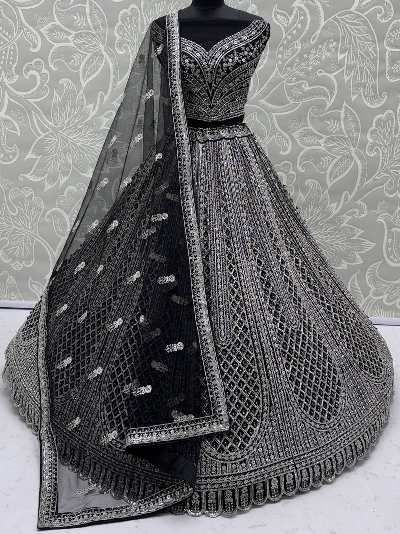 | Product Description | This Stunning Lehenga Is Crafted In A Rich Black Shade Using Heavy Net Fabric, Giving It A Luxurious And Regal Appeal. It Is Beautifully Adorned With All Over Sequin Work, Butterfly Motifs, Multi Thread Embroidery, And Zircon Diamond Studding For An Elegant Sparkle.